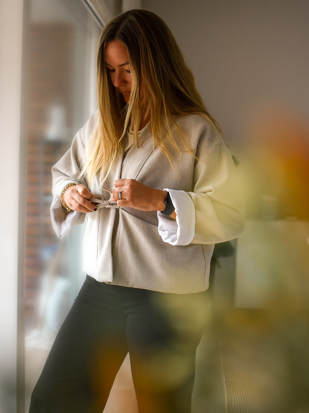 The Alma jacket is open in the front, but you’ve also got two options to close the jacket: sew a waistband that goes all round the jacket through loops in the side seams; or two narrow bands that make front ties.