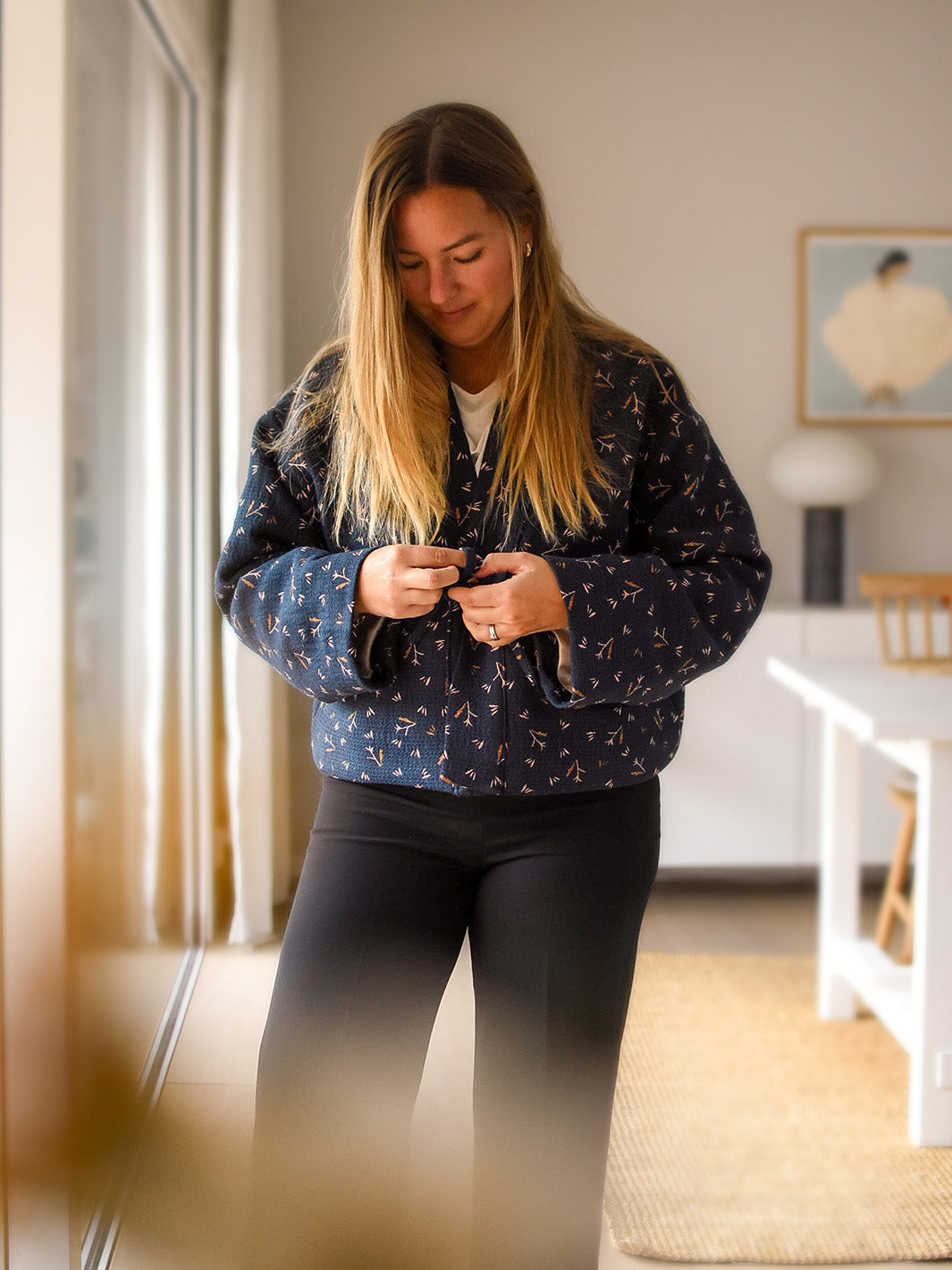 Alma can be sewn with 3/4- or long sleeves. You can sew them lined, hemmed or with a binding. The front pockets are optional, but they make a great addition to your jacket. You can line, hem or sew them with a binding.