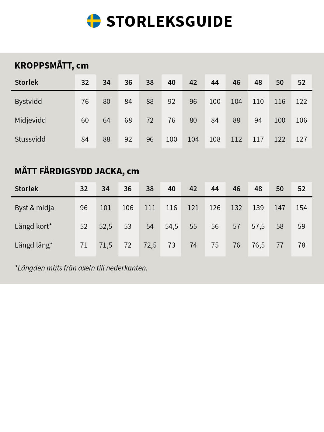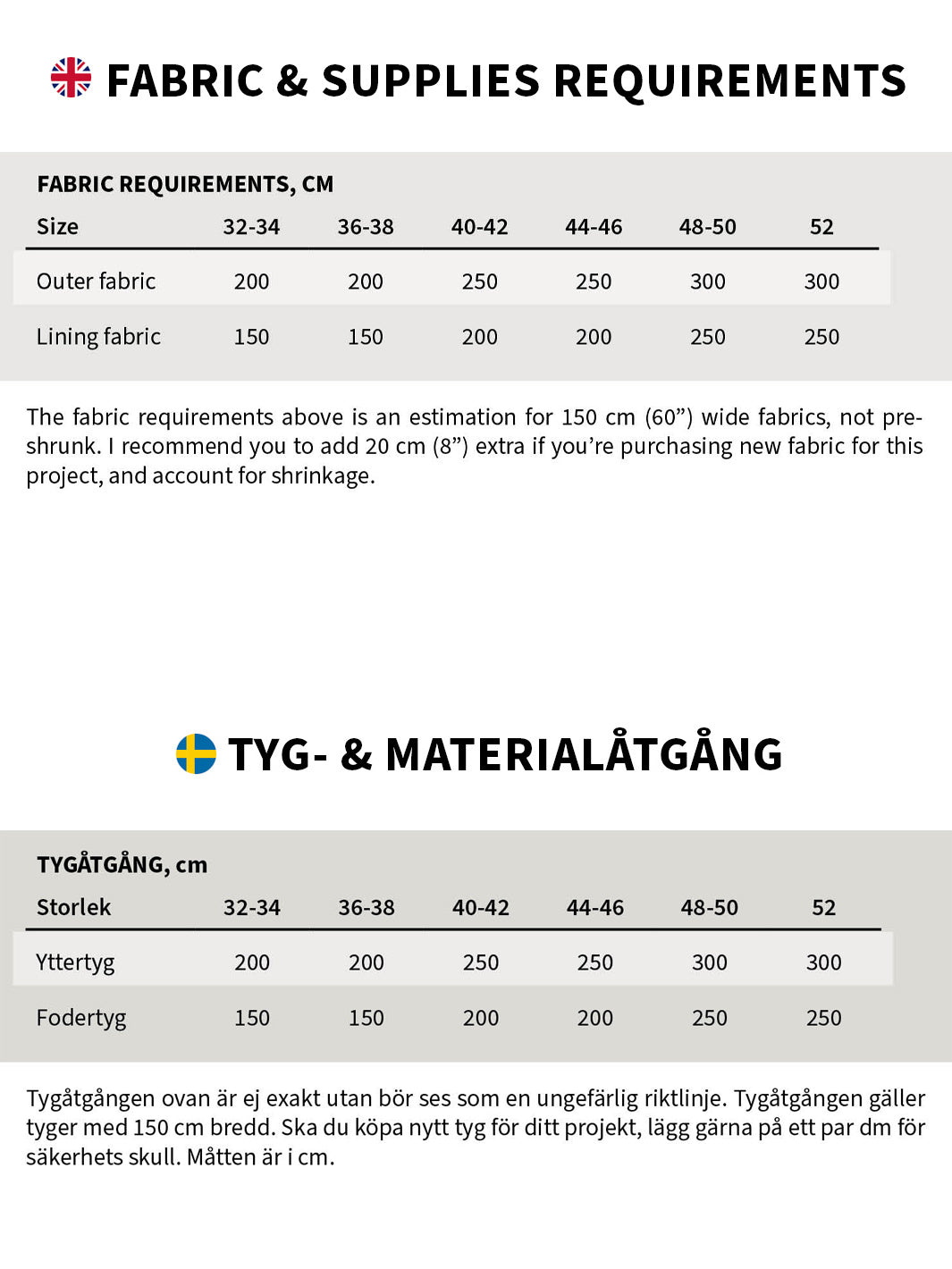 - Outer fabric, woven fabric with little or no stretch. Very light to medium heavy weight (up to 340 gr/m2). Suggestions: cotton, poplin, linen, quilted fabric, teddy, seersucker, double gauze, viscose, denim, chambray, bouclé, wool, tweed, jacquard. Note! Most fabrics shrink with the first wash, so prewash all fabrics before cutting. You can also use knit fabrics, but consider sizing down (see the sewing instructions).